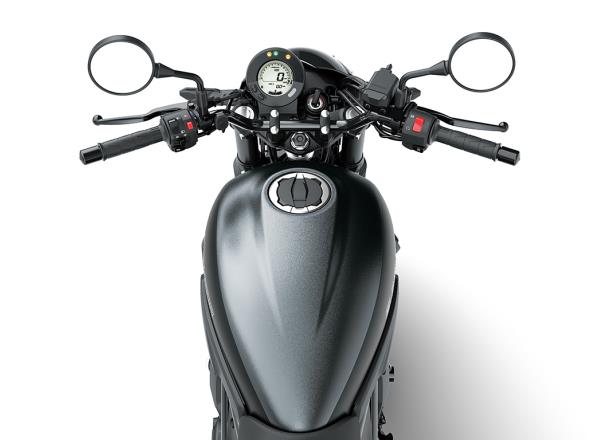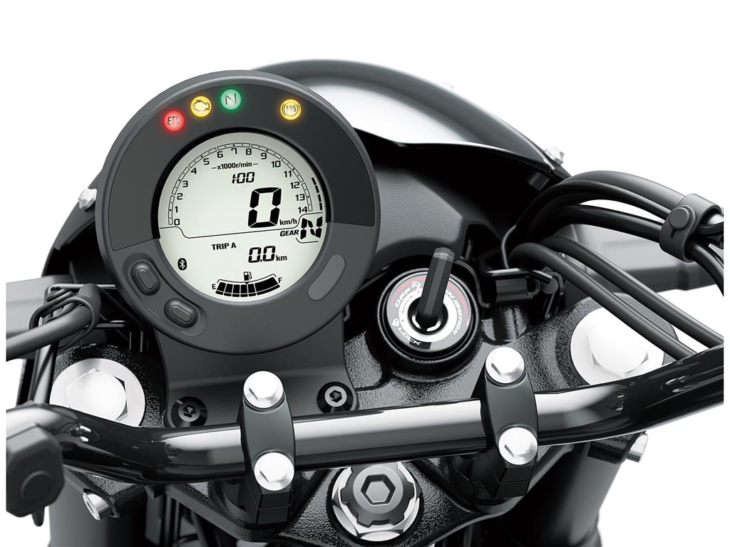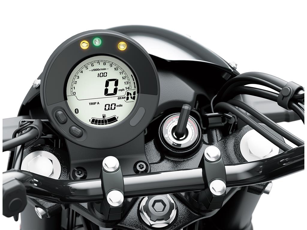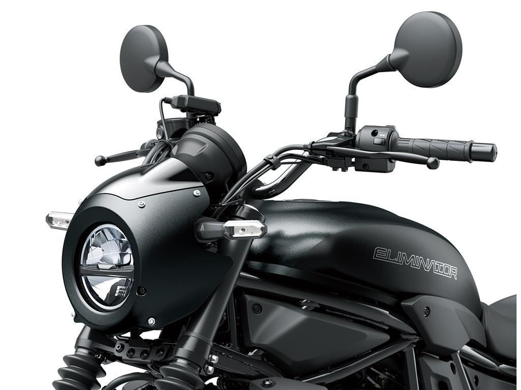 Compact, round, all-digital LCD instrument panel offers a modern touch that complements the Eliminator’s authentic style. The highly legible layout includes a barstyle tachometer and gear position indicator – visible reminders of the Eliminator’s active riding potential. Smartphone connectivity enables riders to access instrument functions for an enhanced motorcycling experience.