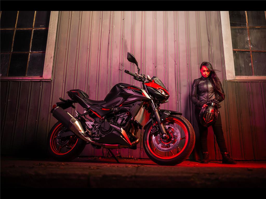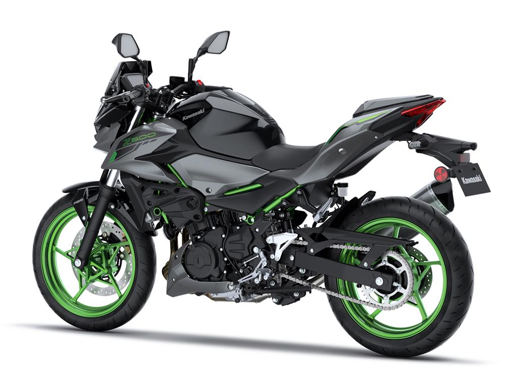 The new Z500 has a sharp, aggressive style and retains the large-volume design of other bikes in the Z series to create an aggressive, agile, street-oriented look. Its muscular, athletic bodywork reflects its performance while forming a flowing design that appears to float above the engine. Like other models in the Z Series, sugomi design elements (crouching stance, lowpositioned head and upswept tail) give it a silhouette instantly recognisable as a Kawasaki Supernaked.