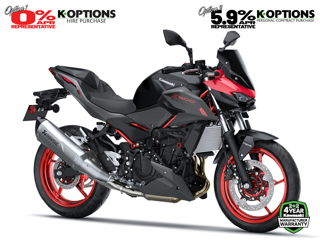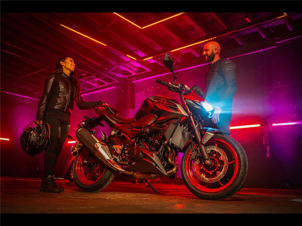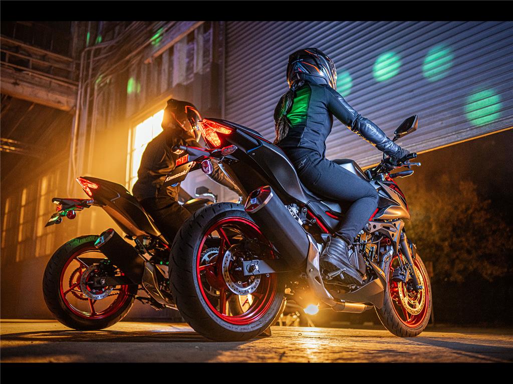 No matter from what angle the Z500 is seen, its triple headlightcentred front face and aggressive lines make it clear that this is a member of the Z family, with aggressive Supernaked looks and ample street presence.