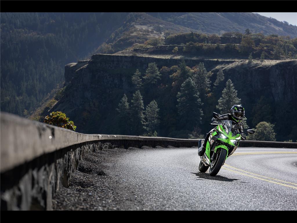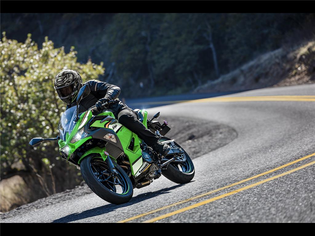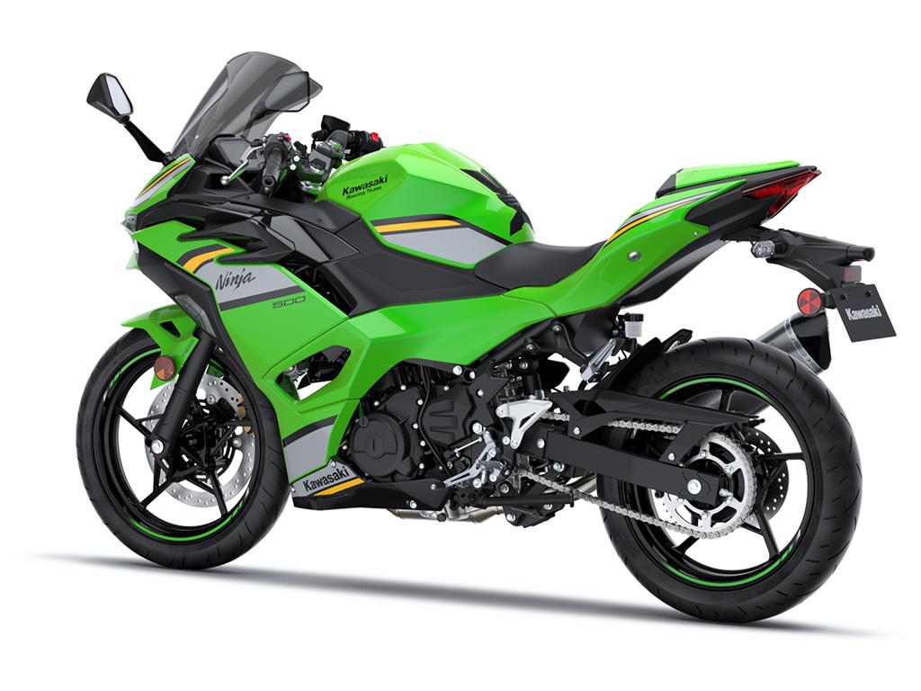 No matter from what angle the Ninja 500 is seen, its distinctive front face and sleek, flowing lines make it clear that this is a member of the Ninja family, with race-inspired, big-bike looks. The shape of the full-fairing bodywork fosters a sense of unity with the rider, helping them feel at one with the bike.