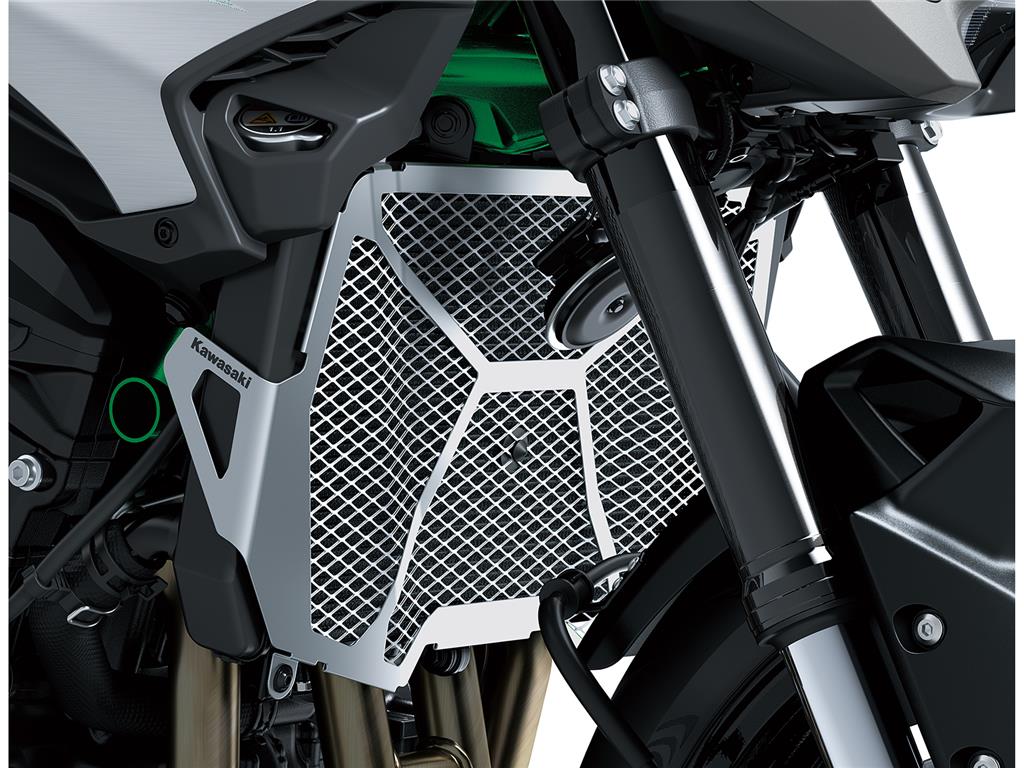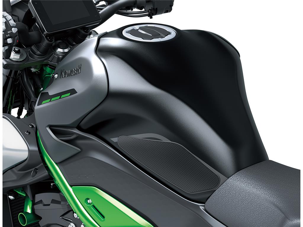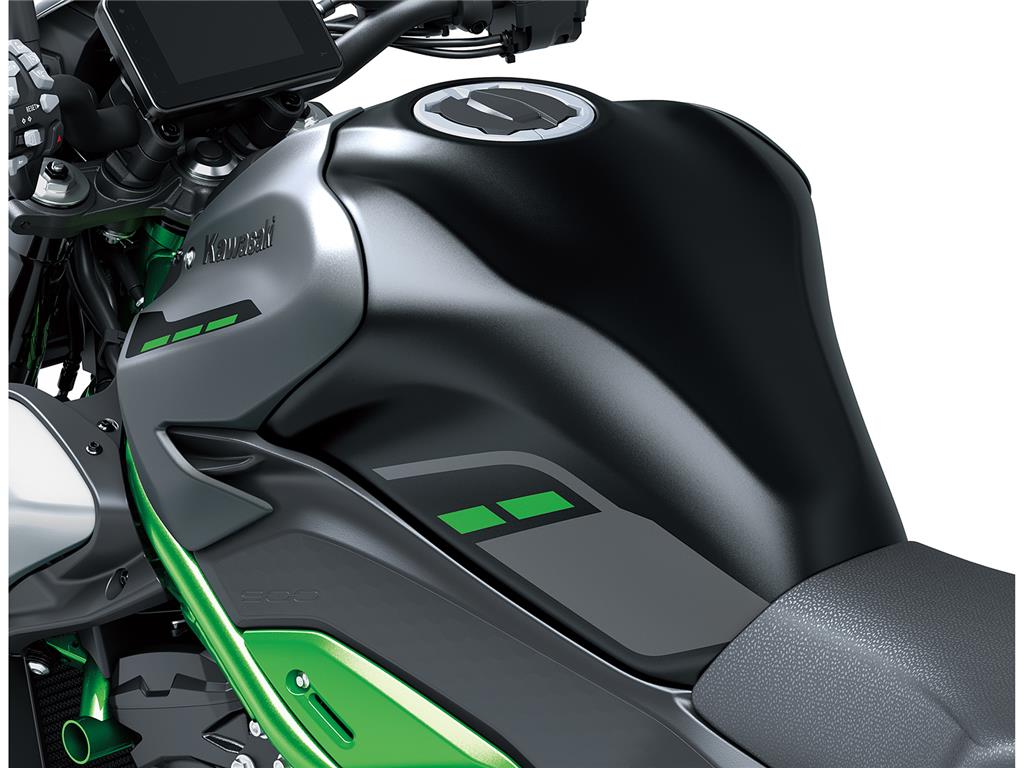 Brushed aluminium side shrouds, plated parts around the key cylinder, and a metal ornament located above the seat featuring the Kawasaki logo are attractive accents that give the Z900 a high-quality, metallic look.