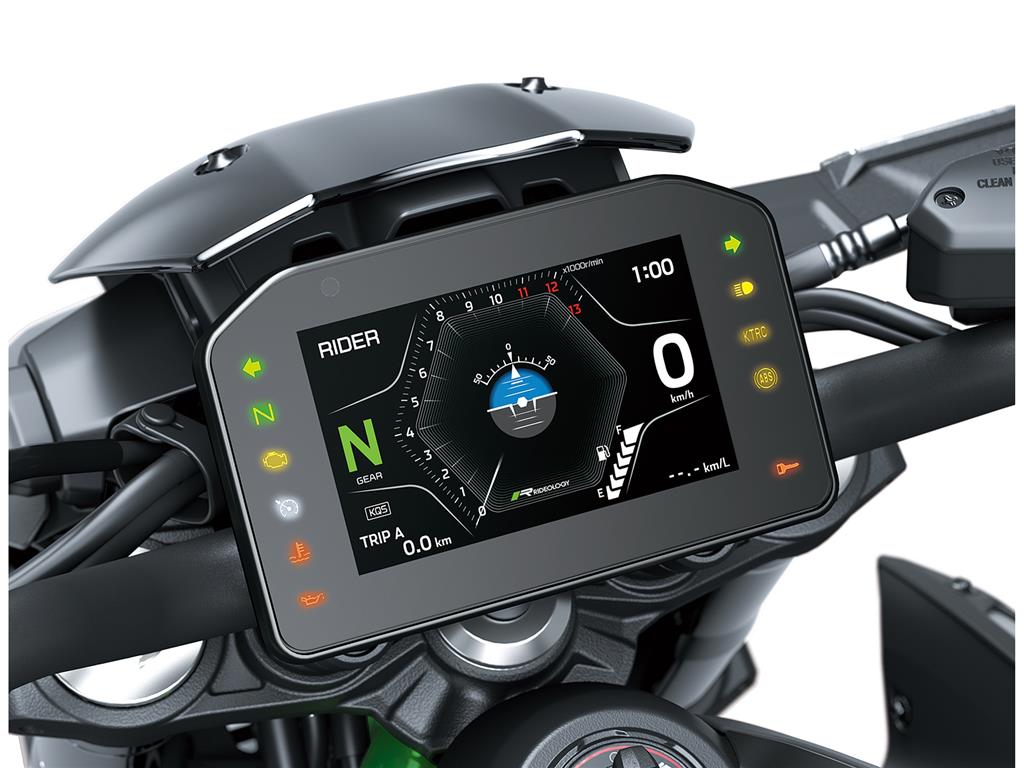 In a Kawasaki first, turn-by-turn navigation can be displayed on the instrument panel, allowing the rider to see where the next turn should be made, while compatibility with RIDEOLOGY THE APP MOTORCYCLE allows the rider to control various functions by voice. *Voice command and navigation functions will be available only to users who have a license. Feature availability varies by market.
