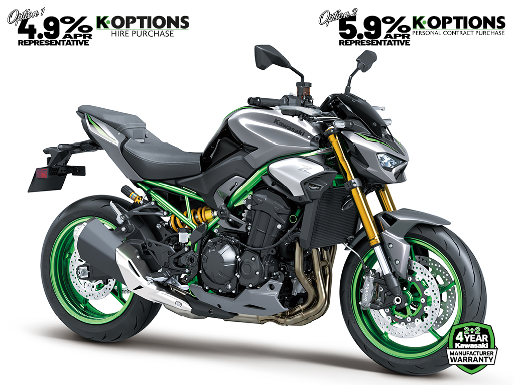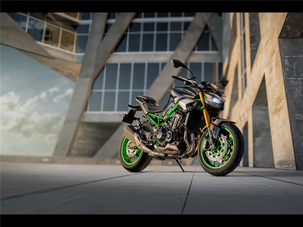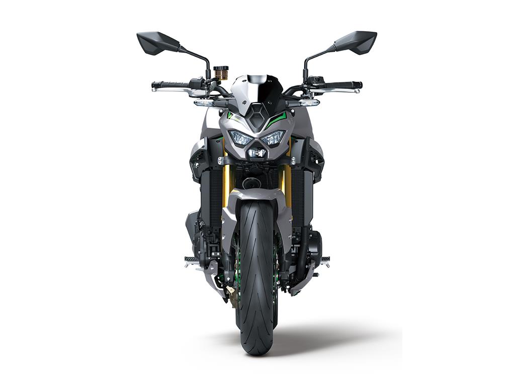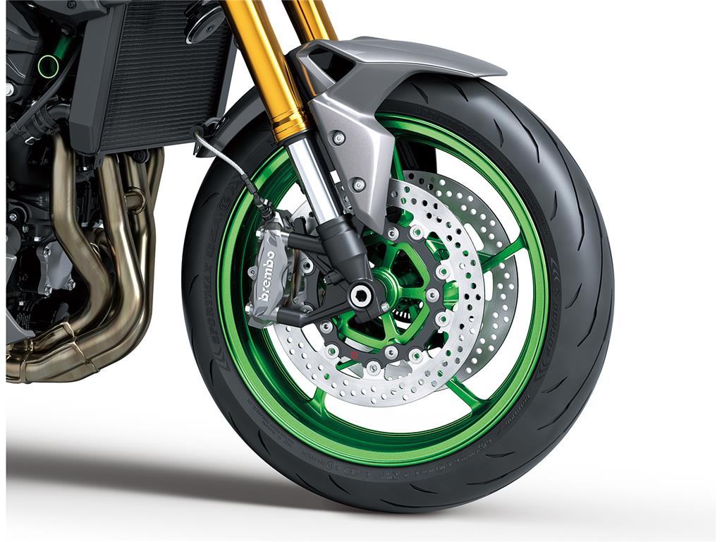 ø300 mm Brembo front discs, M4.32 radial-mount monobloc calipers (same spec as the Z H2) and pads complemented by a Nissin radial-pump master cylinder and stainless-steel braided lines deliver greater stopping power and offer a linear progression when operating the lever that facilitates precise control.