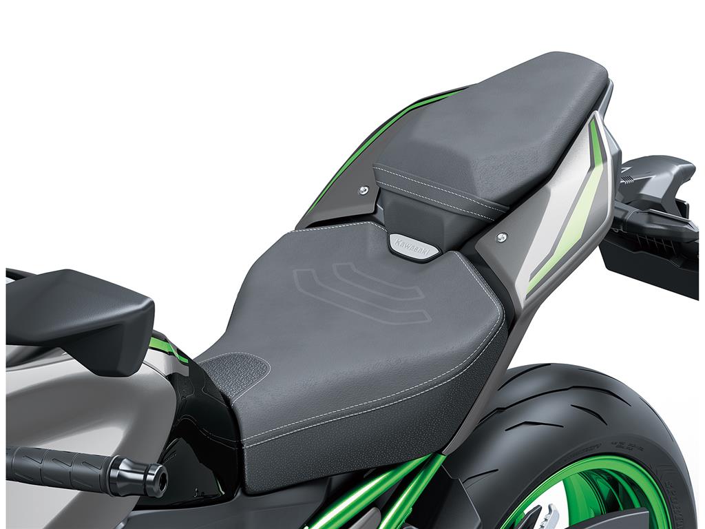 A high-quality two-tone seat with a real leather-like look features a Kawasaki-first hand-stich-style sewing line along the thigh area (lower part of the seat).