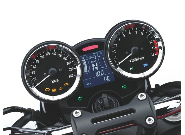 Analogue-style speedometer and tachometer dials are complemented by a multifunctional LCD screen, balancing retro-style looks with modern functionality.