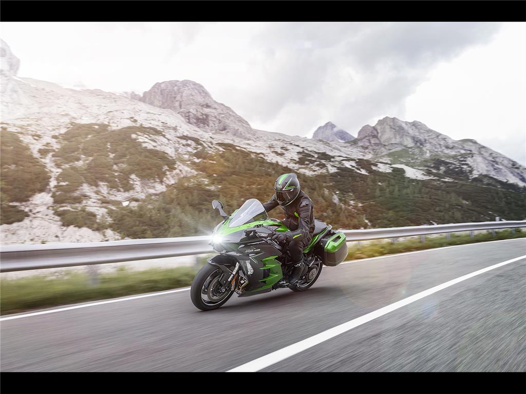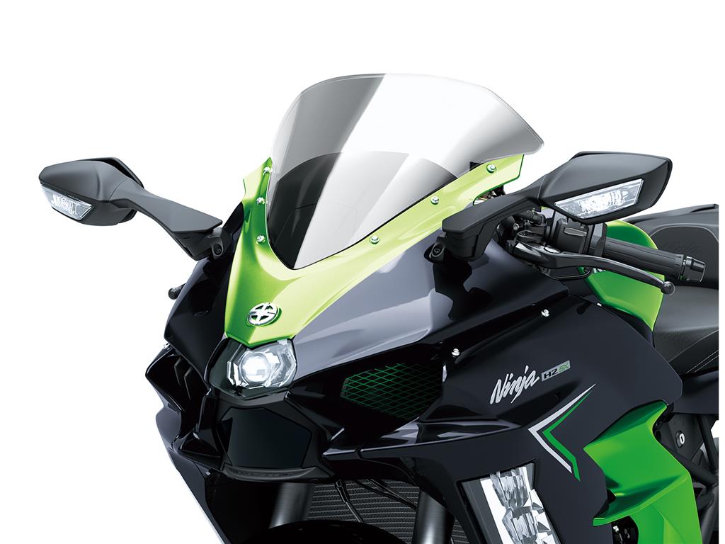 With its large windshield and full-fairing bodywork, the Ninja H2 SX provides substantial wind protection, contributing to rider comfort on long rides. In addition to contributing to sporty styling, the aerodynamically shaped bodywork is also a benefit when riding at highway speeds.