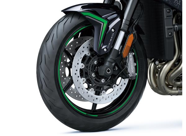 To be easy to ride at low and medium speeds, as well as high speeds, the Z H2 needed a brake system that matches its performance. The front brakes are gripped by Brembo M4.32 monobloc calipers. Machined from cast aluminium blocks, their highly rigid one-piece structures boast strong braking force. The calipers are radially mounted, further contributing to their high performance. The Nissin master cylinder, fine-tuned with Kawasaki original settings, offers functionality perfectly matched to the Z H2’s character, enabling riders to not only control deceleration from various speed ranges, but also to use the brakes to initiate weight transfer to change the bike’s posture on corner entry.