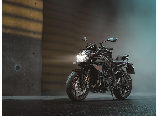 The styling of the Z Series flagship Z H2 was shaped according to its SUGOMI & Minimalist design concept. Its dynamic crouching form, which calls to mind a predator poised to attack, and the asymmetric Ram Air intake on its left side are elements of its fiercely intense and highly individualistic SUGOMI design. Its compact chassis is the product of a minimalist design philosophy, with all functional parts shown simply, without flourish, and made as small as possible. Conversely, the prominent display of the new steel trellis frame its aluminium pivot plate only underscores their importance – both functionally and as styling elements. Finally, when discussing the Z H2’s styling, the significance of the Kawasaki River Mark emblem displayed on the headlamp cowl should not be forgotten. Its use, an honour permitted only for machines powered by supercharged engines, confirms the Z H2 as a flagship model.