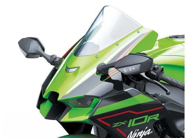 The aerodynamic racer-inspired front cowl, highlighted by compact LED headlights, new Ram Air intake and a taller windshield, is the “face” of the Ninja ZX-10R’s next generation Ninja styling.