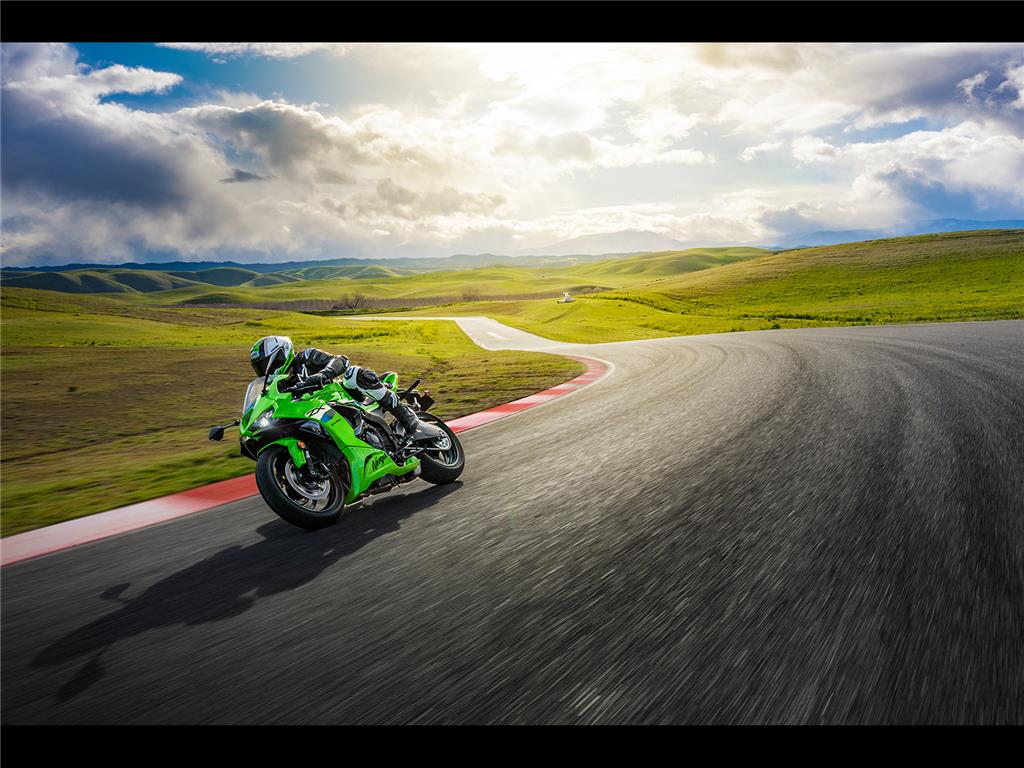 The advantage offered by the Ninja ZX- 6R’s 37 cm3 greater displacement is significant for real world riding exhilaration. Greater performance across the rpm range is welcome when sport riding, both on back roads and on the racetrack. But stronger low and mid-range torque compared to “ordinary” mid-size supersport models also offers increased usability in everyday street riding situations, like riding in stop-and-go city traffic or accelerating to pass another vehicle on the highway. Updates for 2024 include emissions-related adjustments.