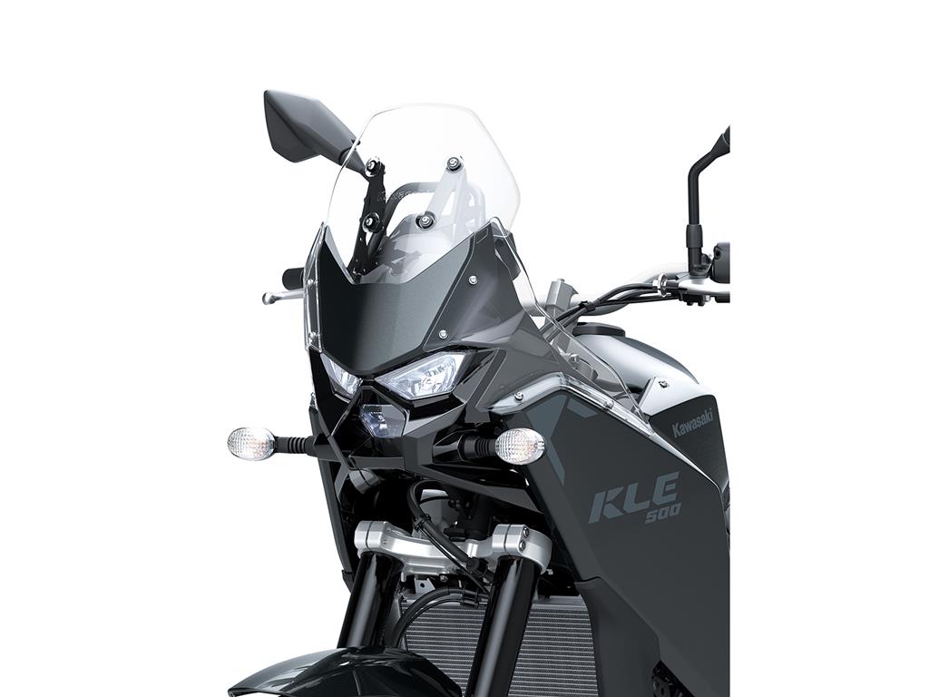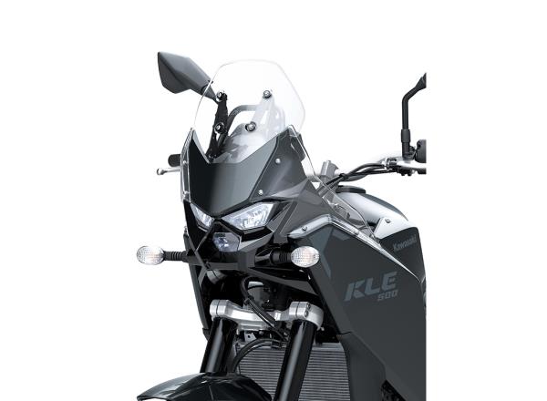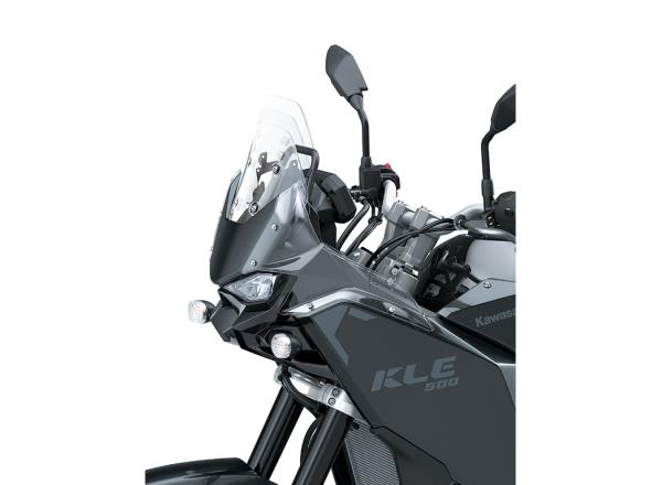 Key to the KLE500’s rally-inspired styling, the tall front cowl rises prominently at the front. The instrument panel’s angle presents a clear view to the rider even when standing, in the style of rally machines. Clear plastic panels surround the front cowl to enhance wind protection and give the front end a highly compact and functional appearance.
