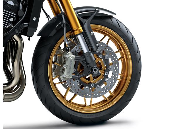 The Z900RS’ suspension and brake components are on par with those of a modern supersport model. A Ø 41 mm inverted fork with adjustable damping and Horizontal Back-link rear suspension contribute to both a comfortable ride and sporty performance. Radial mount front brakes deliver a linear brake feel with excellent controllability.