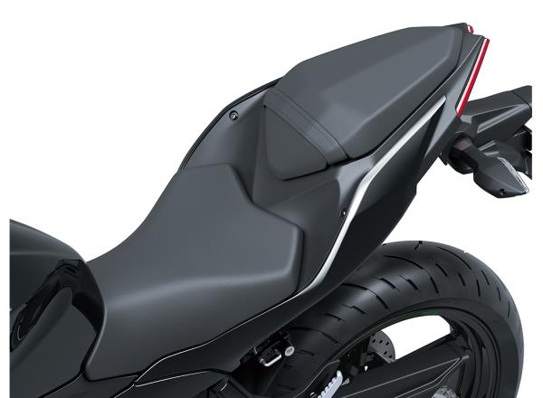 Seats with thick cushioning and low-rebound urethane contribute to superb ride comfort. The Ninja 500’s large volume bodywork also offers great wind protection, further contributing to ride comfort.