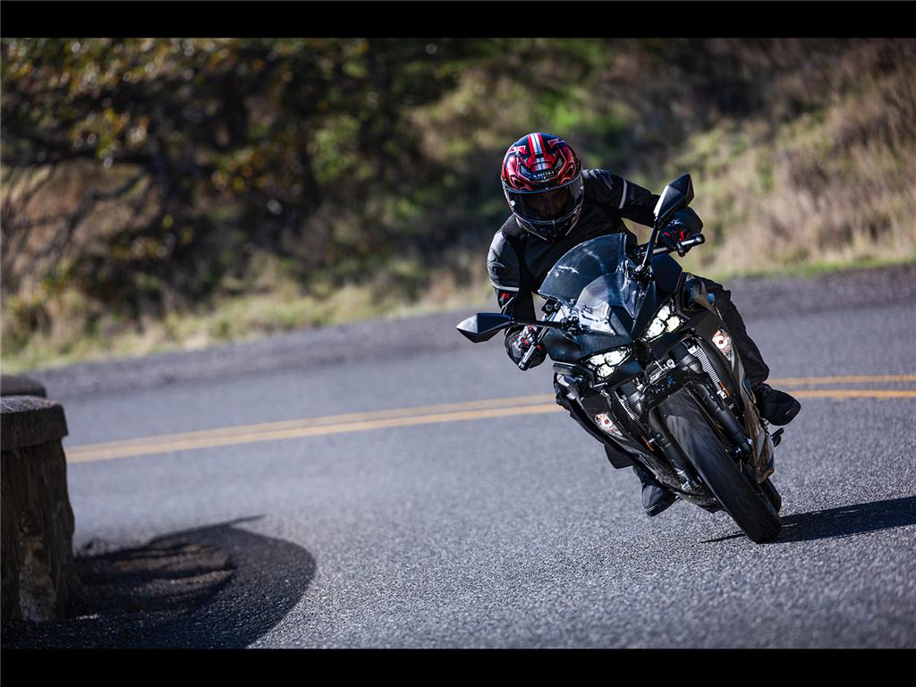 No matter from what angle the Ninja 500 is seen, its distinctive front face and sleek, flowing lines make it clear that this is a member of the Ninja family, with race-inspired, big-bike looks. The shape of the full-fairing bodywork fosters a sense of unity with the rider, helping them feel at one with the bike.